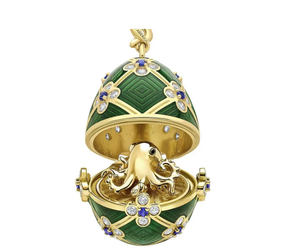 Kuyumcunun sitesine göre kolyede 60 beyaz pırlanta ve 15 mavi safir var. Açılabilen yumurtanın içinde 18 ayar altından küçük bir ahtapot figürü görülüyor.