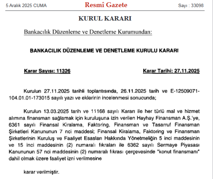BDDK, Mart 2025’te kuruluş iznini verdiği Hayhay Finansman A.Ş.’ye nihai faaliyet iznini tanıdı.