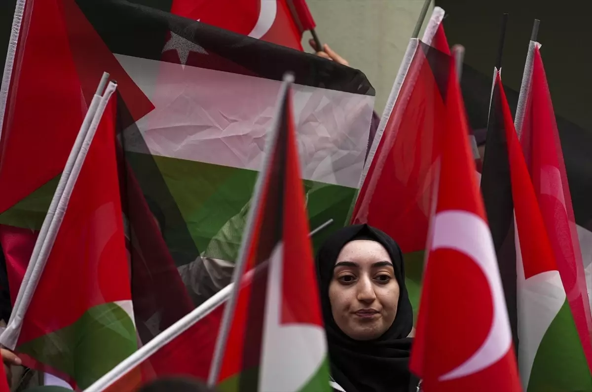 Türk ve Filistin bayrakları taşıyan öğrenciler, slogan attı, İsrail’in Filistin’deki soykırımına tepki gösterdi.
