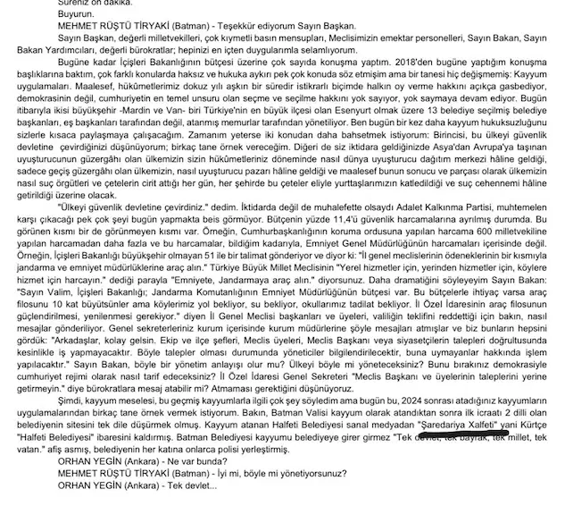Görüşmelerde İçişleri Bakanı Ali Yerlikaya’nın bütçe sunumunun ardından milletvekilleri söz aldı. DEM Parti milletvekilleri Dilan Kunt Ayan ile Mehmet Rüştü Tiryaki’nin konuşmalarında kullandıkları Kürtçe kelimeler ilk kez TBMM tutanaklarına yansıdı. Tiryaki, “Jin kart” ve “Şaredariya Xelfetî” (Halfeti Belediyesi) ifadelerini Kürtçe kullandı.