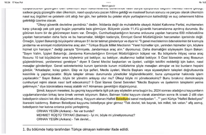 Kürtçe ifadeler yerine tırnak içinde 3 nokta işareti kullanılırken sayfa sonunda “Bu bölümde hatip tarafından Türkçe olmayan kelimeler ifade edildi” notu yer aldı.