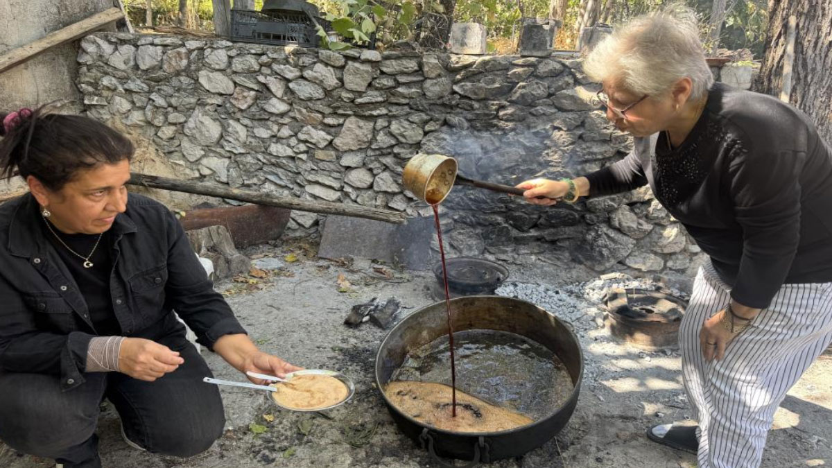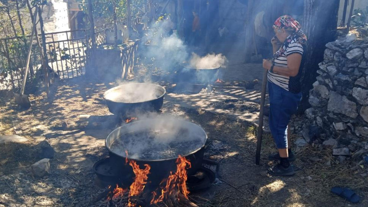 Doğal üretimin göstergesi olarak arıların bile pekmeze ilgi gösterdiğini söyleyen Gümüş, “Doğal olduğu için arılar geliyor. Doğal olmasa zaten gelmezler. Üzümümüzü sıktık, külü koyduk, pekmezimizi yaptık. Afiyetle yiyeceğiz” dedi.
