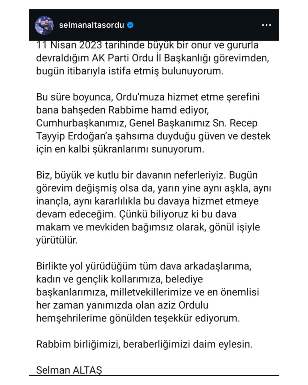 “11 Nisan 2023 tarihinde büyük bir onur ve gururla devraldığım AK Parti Ordu İl Başkanlığı görevimden, bugün itibarıyla istifa etmiş bulunuyorum.