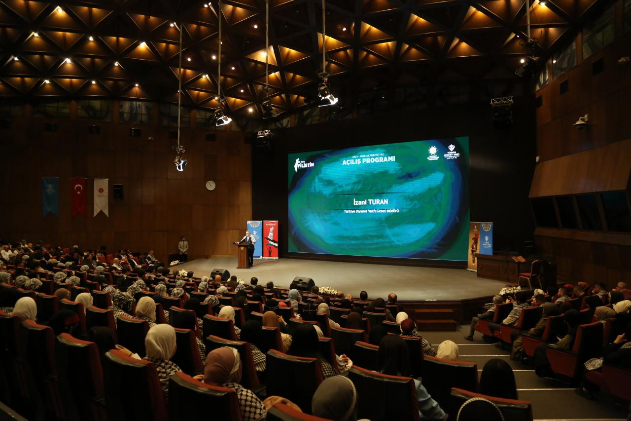 Türkiye Diyanet Vakfı (TDV) Genel Müdürü İzani Turan, “İlk Ders: Filistin” programının açılış konuşmasında akademik yıl açılışını sevinçle yapamamanın hüznünü yaşadıklarını dile getirdi. Turan, “Hepimiz yürekten yaralıyız. Ciddi bir şekilde mahcubiyetle icra ettiğimiz bir programın açılışını yapıyoruz. Keşke ‘Ey gençler, sizi yeryüzünde mutlu bir gelecek ve hayat bekliyor. Sizleri özgür, adaletin, merhametin, sevginin ve şefkatin hakim olduğu, zulmün olmadığı bir dünyaya yelken açmak üzere yetiştiriyoruz. Siz de o gemiye katkı sağlayan yolcular olacaksınız’ diyerek başlayabilseydim.” ifadelerini kullandı.