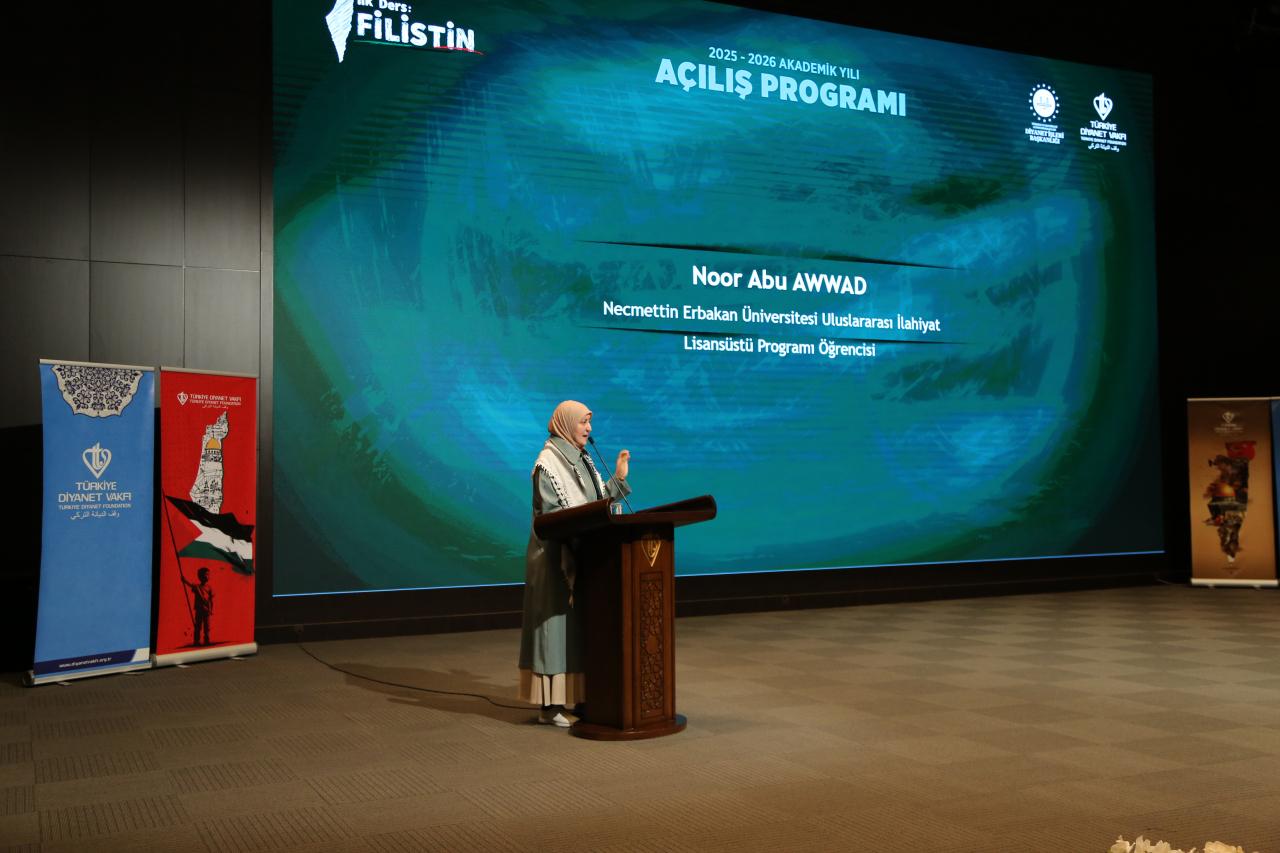Necmettin Erbakan Üniversitesi Uluslararası İlahiyat Lisansüstü Programı öğrencisi Noor Abu Awwad, programda yaptığı konuşmada “Sorumluluğumuz çok büyük. Sadece üzülmek yetmez; bu üzüntüyü gerçek bir çalışmaya dönüştürmeliyiz. Her birimiz, kendi yetenekleri doğrultusunda ümmete faydalı olacak şekilde çaba göstermeliyiz.” dedi.